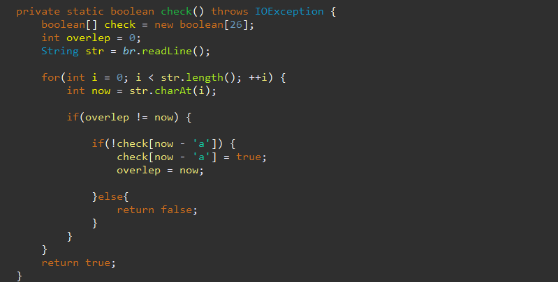 1. boolean 타입의 check[] 배열은 앞서 한번 나왔던 단어가 다시 나오는지 체크해주는 역할을 한다.