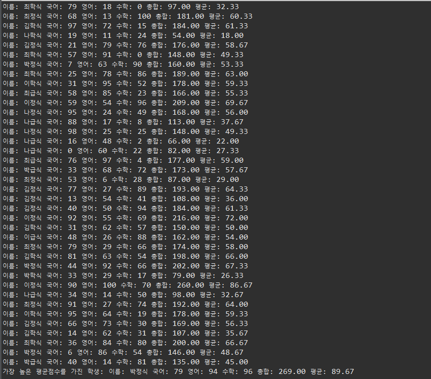 [studentClass] 클래스는 학생들을 100명을 만들어 평균점수가 가장 높은 학생을 확인하는 클래스이다