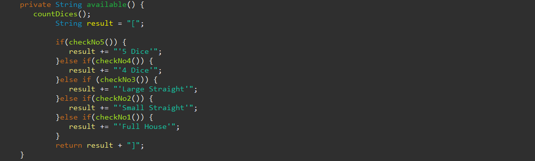 다이스의 값을 체크하는 메서드들을 체크하여 어떤 값(5 Dice, Full House 등...)을 가졌는지 체크하여 출력해준다.
