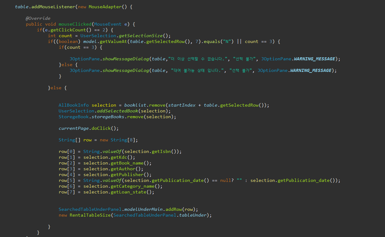 2.처음 테이블에 들어갈 초기값은 initTableBookList() 메서드로 이중배열 데이터값을 받고 columnNames배열을 통해 컬럼네임값을 받는다.(initTableBookList() 은 이전 글에 포스팅되어있다)