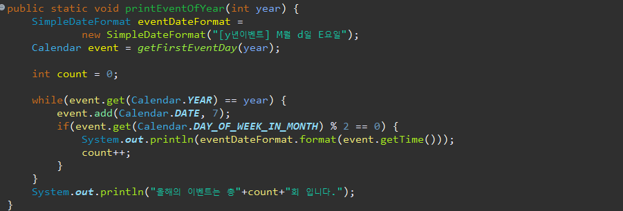 이벤트에 해당하는 년도는 반복문이 돌때마다 일수에 7일씩 더해주기 때문에
