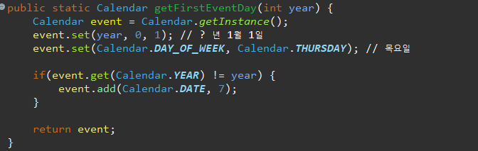 (Calendar객체에 set메서드를 통해 해당 년도의 첫번째 목요일로 셋팅해준다