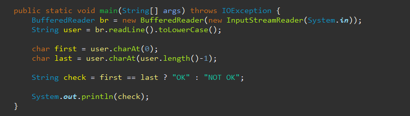 첫 번째 글자가 영어이면서 마지막 번째 글자와 일치하면 OK"를 출력하고