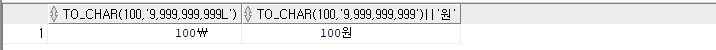 SELECT to_char(100, '9,999,999,999') || '원' FROM dual; 이어서 붙일 수 있음