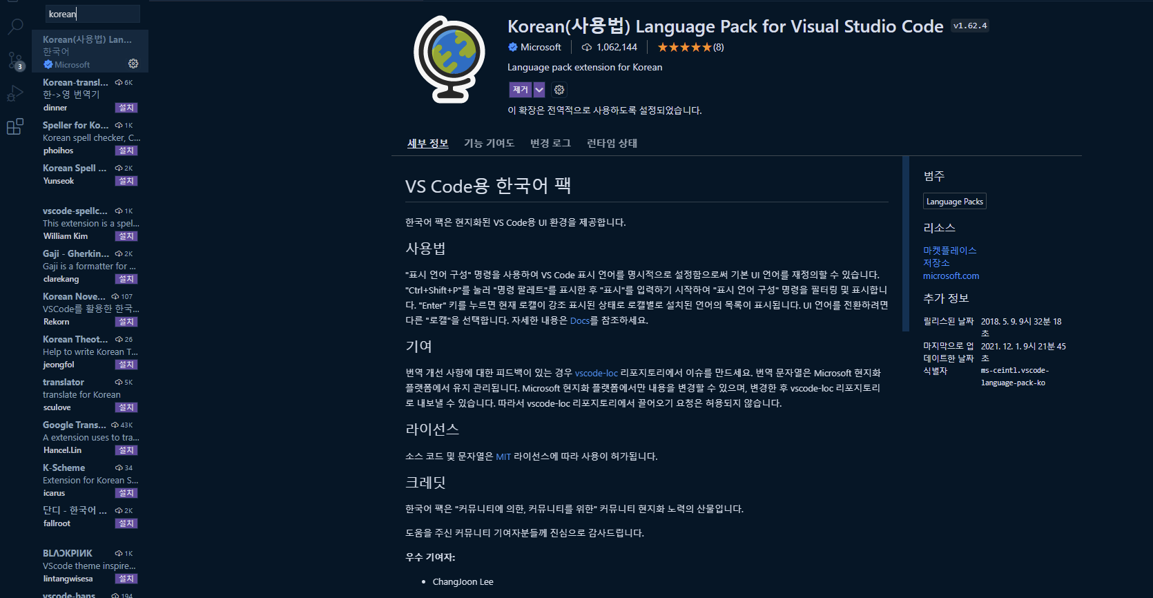 만약 한글패치가 되어있지 않다면 아래 이미지처럼 검색하여 install 해주면된다.