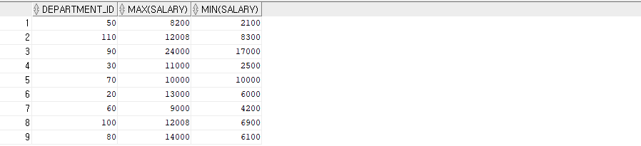 -- 연습1: 부서별 최대 급여와 최소 급여를 출려하되 최대 급여가 8000이상인 부서만 출력해보세요
