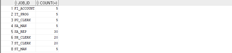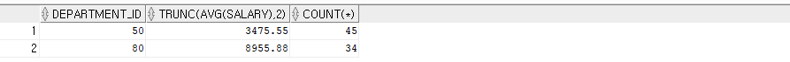 SELECT department_id, count(*) FROM EMPLOYEES WHERE salary >= 8000 GROUP BY department_id; -- 8000이하의 부서 등장도못함