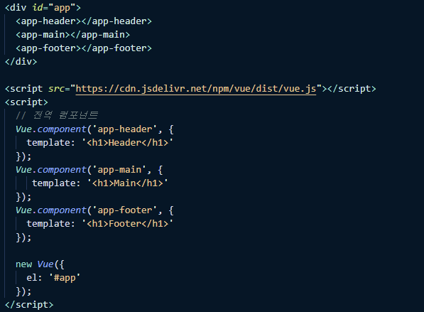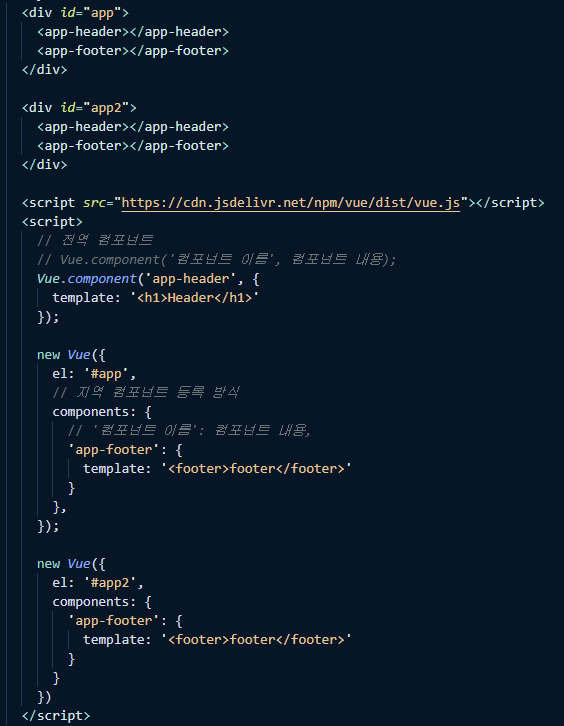 전역 컴포넌트 : Vue.component를 사용할때에는 플러그인이나 라이브러리 형태로 전역으로 사용해야하는