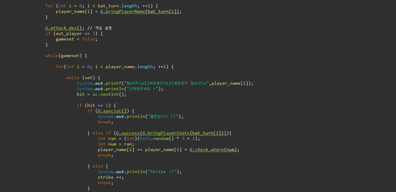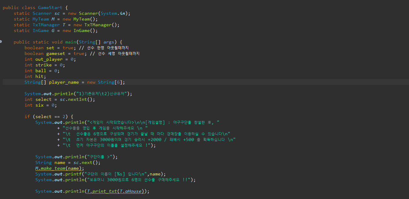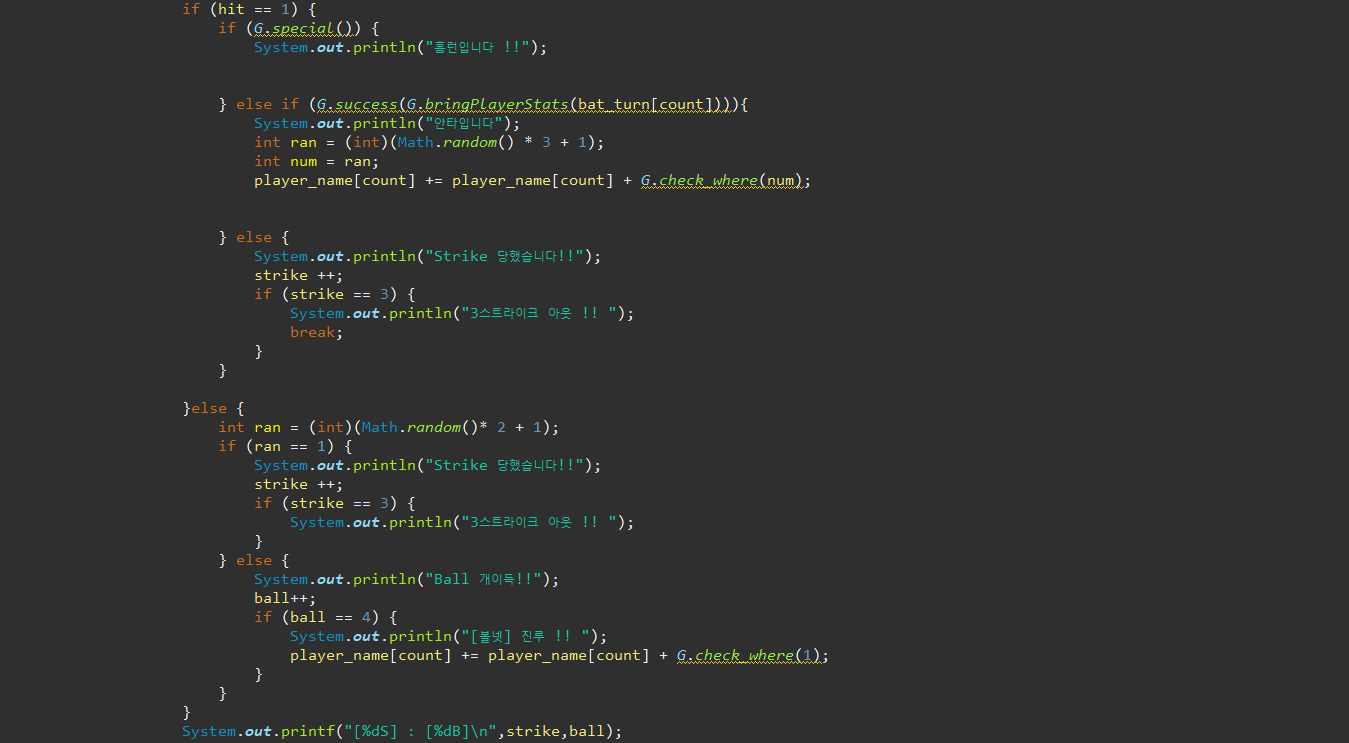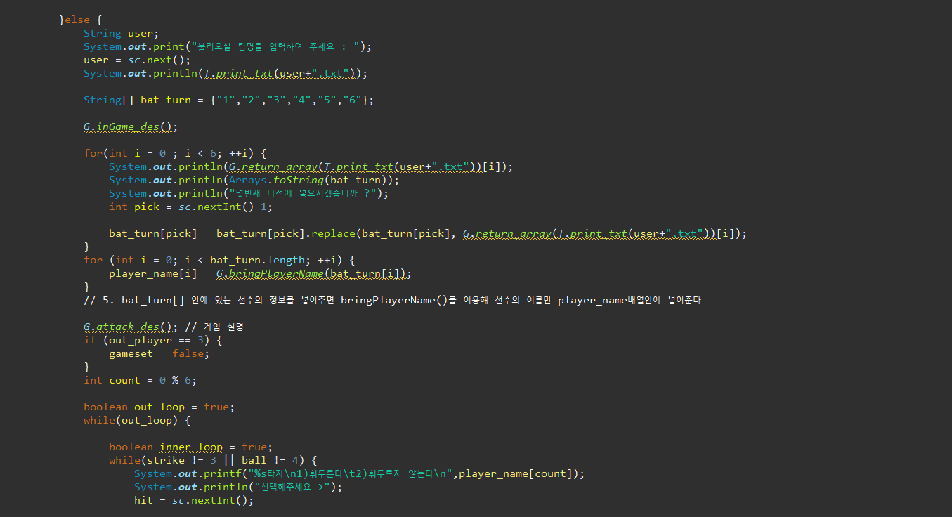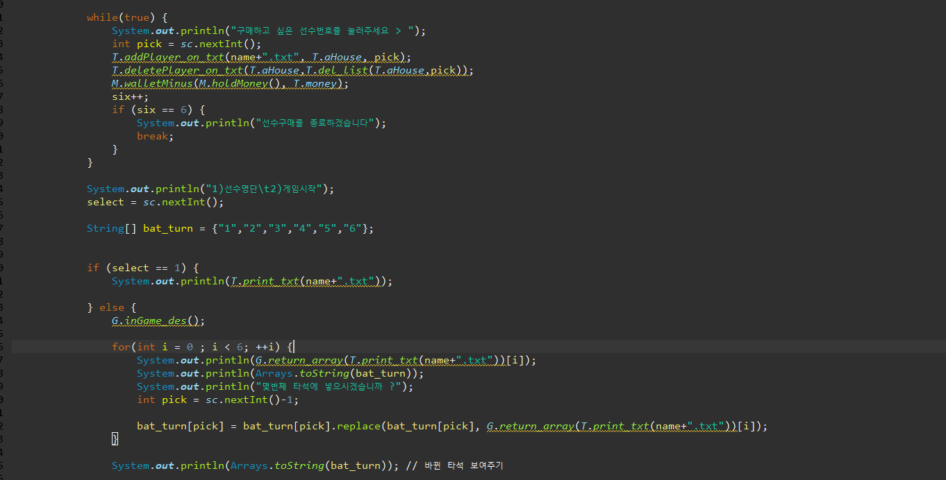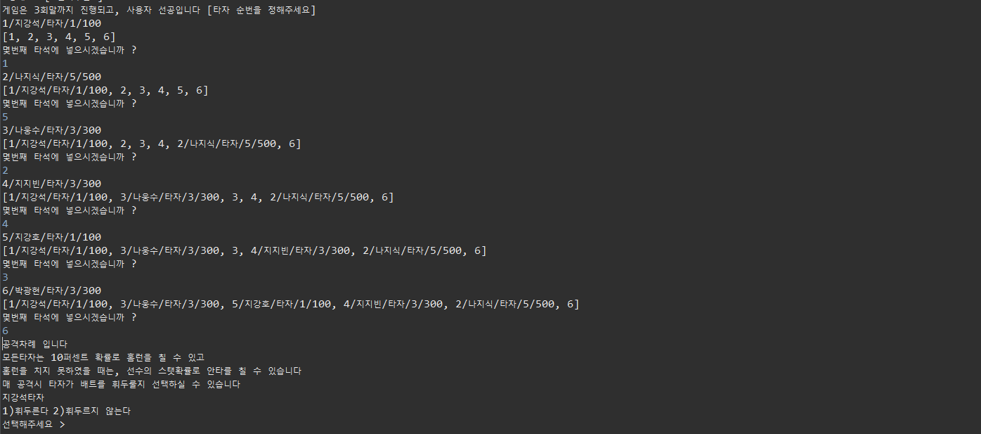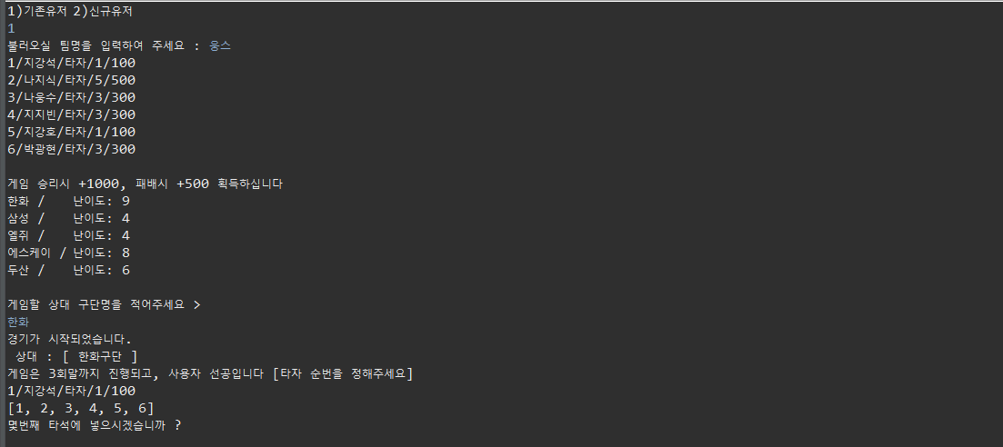 자기가 경매장에서 산 구단을 불러서 상대하고싶은 상대 선수단을 선택하고 타자를 원하는 순서대로 타석에 배치하는 것 까지는 구현을 하였는데 그 이후 홈런,안타 공수 교대는 아직 구현되지않은 상태이며