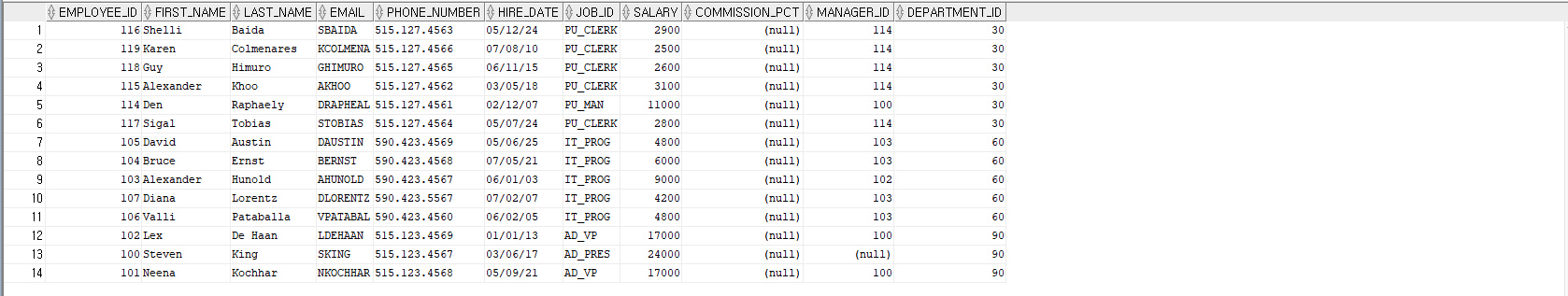 SELECT * FROM employees WHERE department_id IN(30,60,90) ORDER BY department_id ASC, last_name ASC;