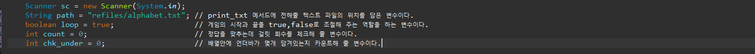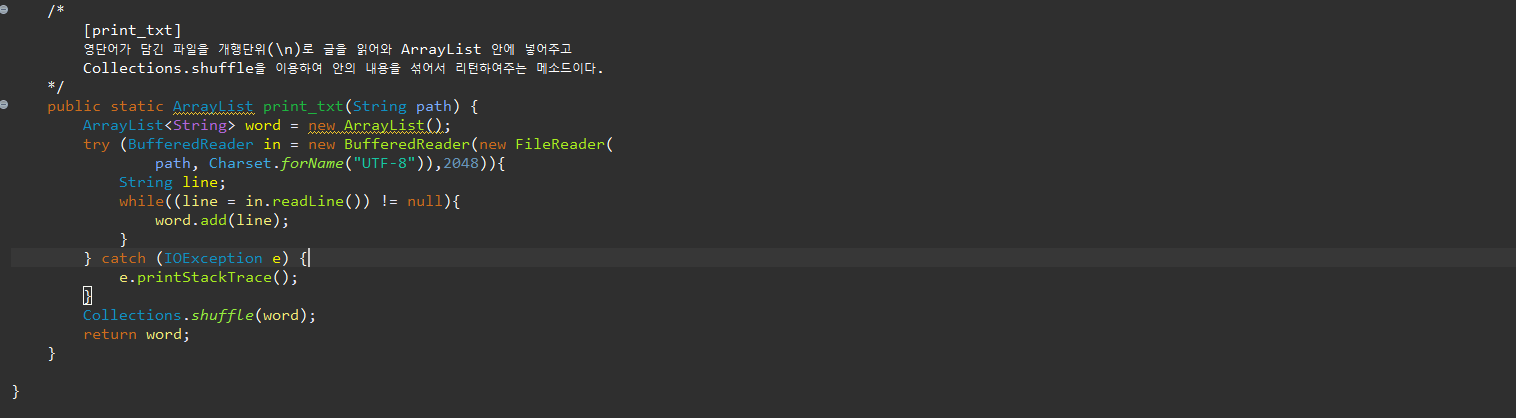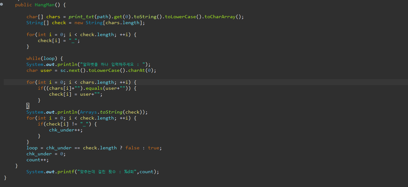 print_txt를 이용해 받아온 단어를 toLowerCase와 toCharArray를 이용해 char타입 배열로 만들며 소문자로 변환