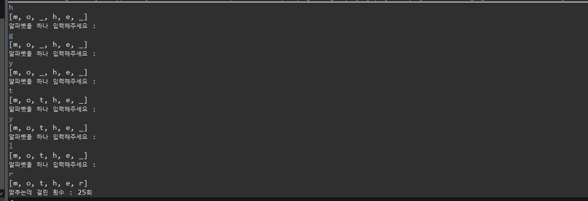 user로 사용자에게 입력받은 단어가 chars(랜덤으로 받은 char타입 영단어 배열) 안에 있는 단어를 하나씩 검사하여