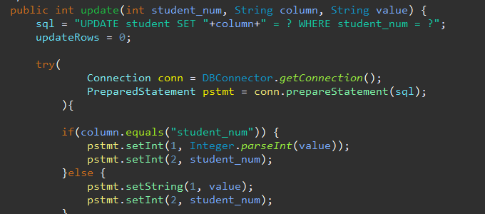 그래서 "UPDATE student SET "+ column +" = ? WHERE student = num ?"