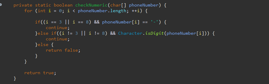 3.checkNumeric 메서드를 이용하여 숫자인지 '-'가 제 위치에 있는지 체크하여주고 이것또한 !를 이용하여
