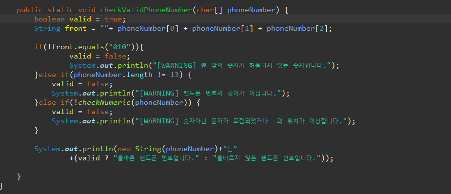 String으로 입력받은 휴대폰 번호를 toCharArray()로 char배열로 만들어 phoneNumver매개변수로 받아