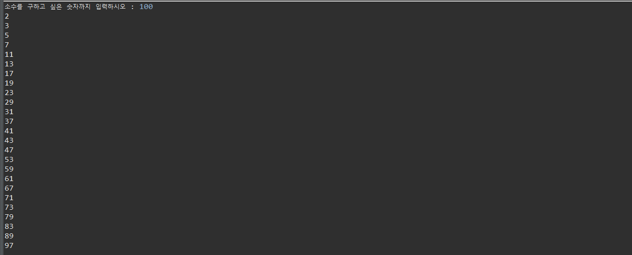 2. 소수를 알고싶은 범위까지의 숫자를 받으니 <=(같거나 클때까지)를 사용하여주고