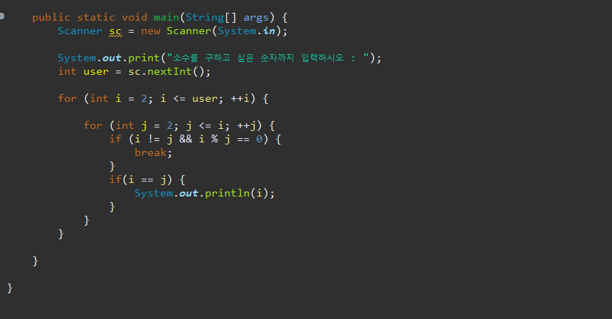 그렇기에 i != j 자기 자신과 같지 않으면서 i % j == 0 약수인것이 있다면 소수가 아니기에 break;를 걸어주고