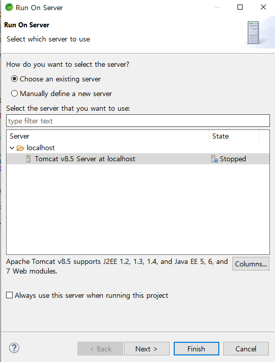 다음과 같은 화면이 나오는데 자신이 사용하는 톰켓을 클릭하고 피니쉬를 눌러준다.