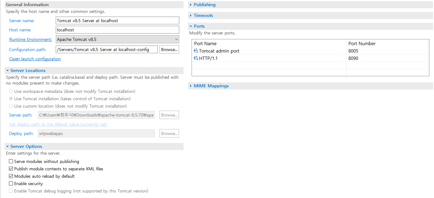 (포트번호는 oracle이 8080을 디폴트로 사용하기에 충돌 방지를 위해 톰켓의 포트번호를 8090으로