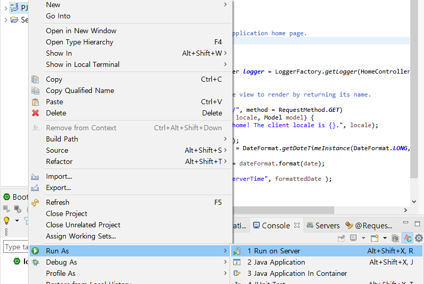 프로젝트를 오른쪽 마우스로 클릭하고 Run as에 들어가 Run on Server를 눌러준다면