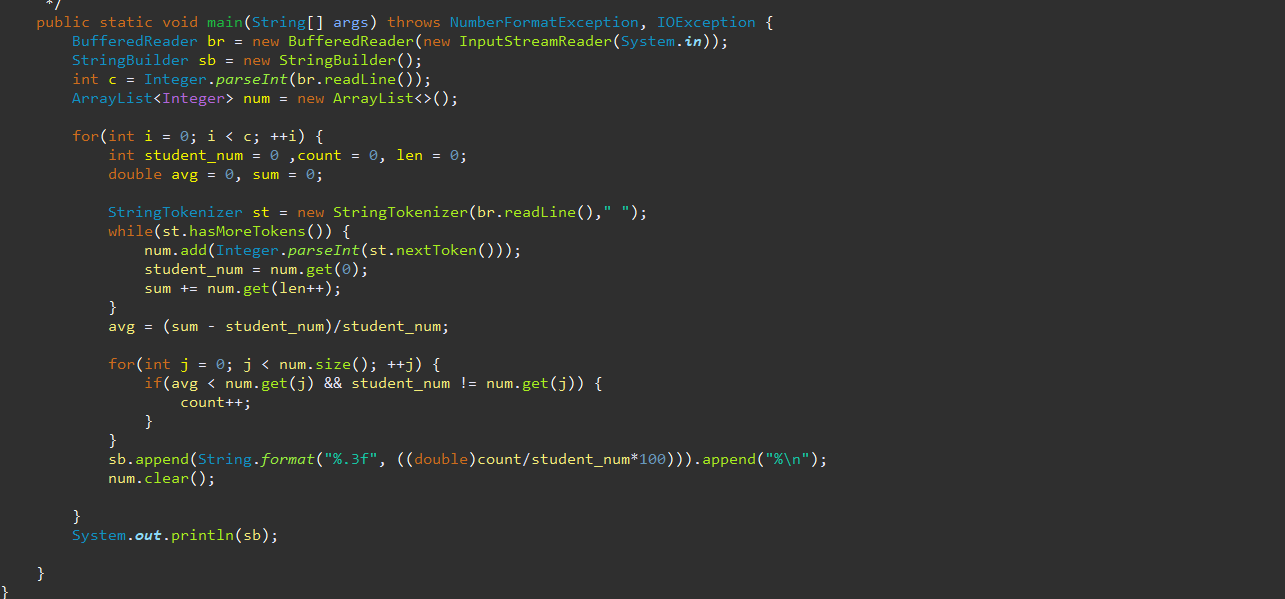 각 케이스마다 한 줄씩 평균을 넘는 학생들의 비율을 반올림하여 소수점 셋째 자리까지 출력한다.